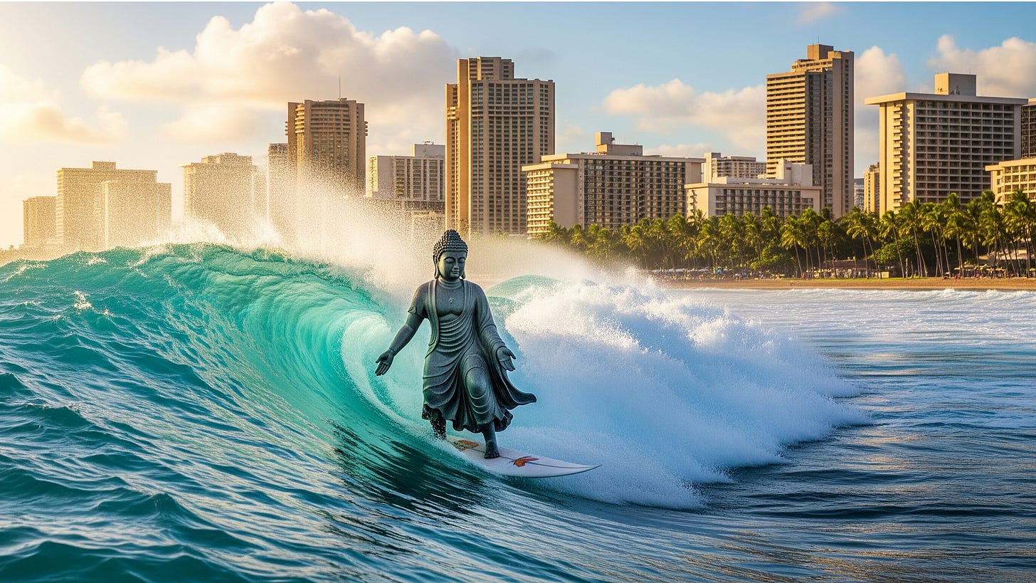 One day this, “older guy,” a Chinese looking bruddah paddles up to me and pointing says “You see that building over there? I own that. …and that one over there …and a few others. When I made my first million I wanted two. When I made two and wanted ten. I spent my life chasing money till I realized, No mo end. That’s when I started surfing every morning.” He gave me a half happy half sad smile and said "Just like you.”
